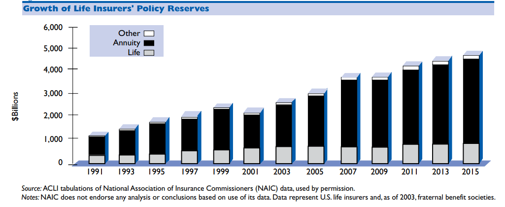 American Council of Life Insurers(ACLI)という、米国の生命保険業界団体の統計資料を見てみると、2015年の米国生保会社の一般勘定の不動産投資総額(MBSは除く)は4380億ドル、デリバティブ資産総額は539億ドル、その他資産は1780億ドルあります。