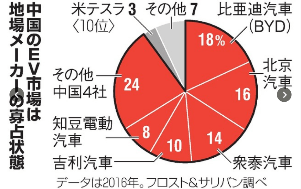 しかし中国の電気自動車市場は中国メーカーの寡占状態となっており、従来のように中国国営企業が外資系メーカーとの合弁で自動車を製造・販売するのみならず、BYDといった独立系中国自動車メーカーも台頭しており、中国市場における中国地場メーカーとの競争は今後ますます熾烈になります。