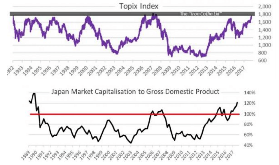 日本株は90年代初頭のバブル崩壊以来、「鉄棺の蓋(Iron Coffin Lid、正確な日本語訳を私は知りません)」という超えられない壁にぶち当たり続けてきました。
