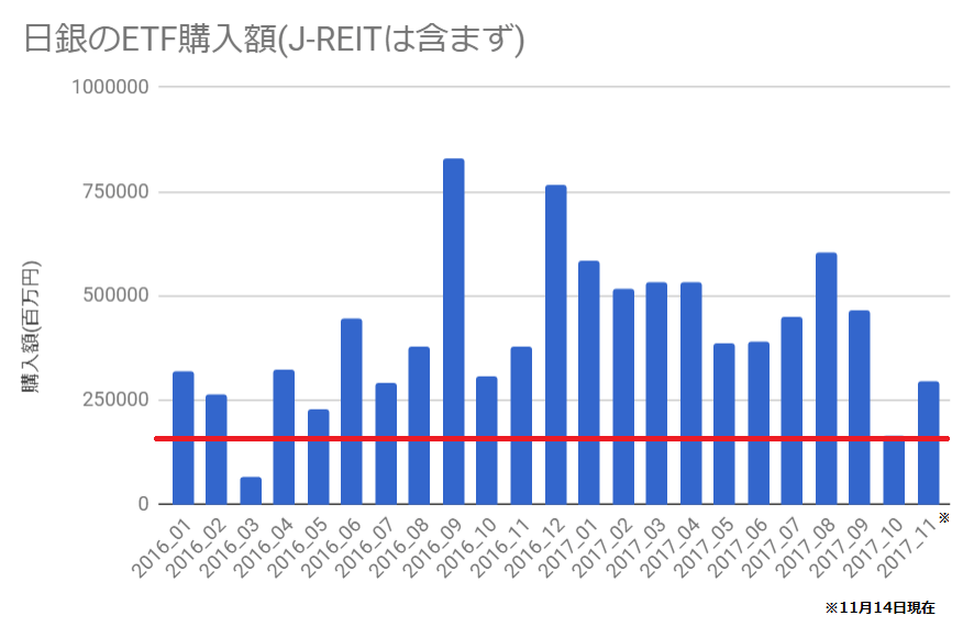 一方、日銀の10月のETF購入額は1670億円で、年初から9月までの毎月のETF購入平均額である5000億円と比較して、圧倒的に少ないのが特徴でした。これは2016年3月の672億円以来の少なさです。