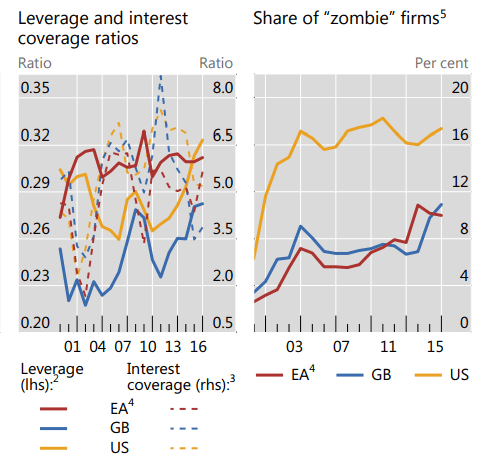 現在の企業の純資産に占める債務の割合(レバレッジ)の高さや、いわゆるゾンビ企業(利子・税金支払い前の利益で、その年のすべての利払いを賄えない企業)の割合は過去最高水準に達しています。特に米国(黄線)が顕著です。