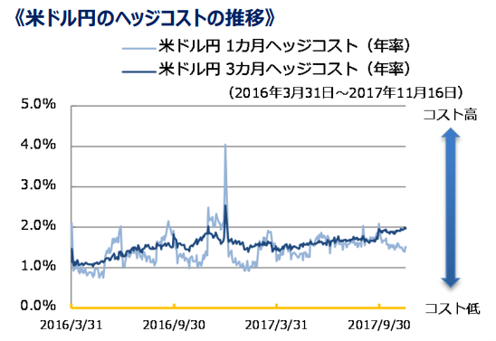 ドルの為替ヘッジ料は上期に1.4~1.7%程度で推移していたが、足元では1.9%近くまで上昇している。