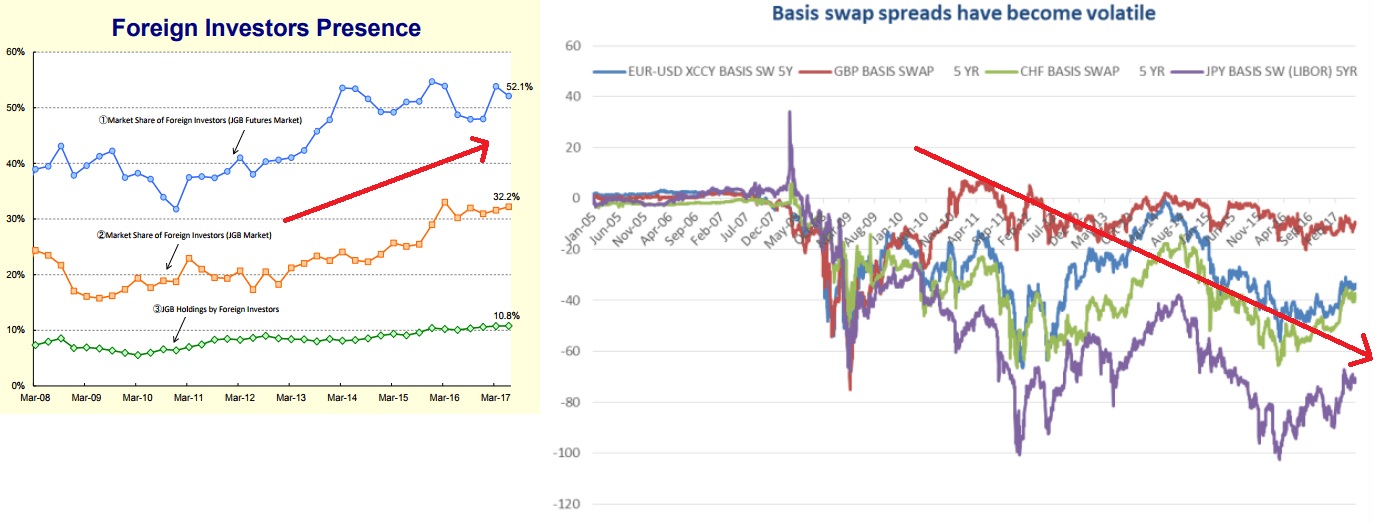 下図右側の紫線の米ドル・日本円のベーシススワップスプレッドが、日本の機関投資家の為替ヘッジコストの一部を成すと同時に、米ドルを渡して日本円を調達する海外勢のリターンとなるのです。海外勢の日本国債市場でのプレゼンス増大と、このスプレッドの拡大が比較的パラレルに動いていることがわかるでしょう。これが海外勢が日本国債投資を増やしてきた元凶なのです。