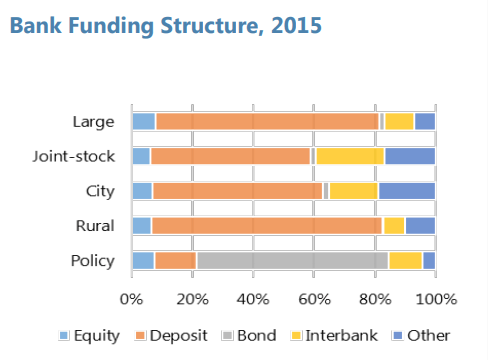 - 全資金調達額に占めるインターバンク借入の割合は、11%(2010)→17%(2016)に増えた。合弁商業銀行と都市商業銀行は、インターバンク借入に22%依存している→金利上昇により短期の資金繰りが困難となり、突然死するリスクが無視できないということ(下図の黄色の大きさがリスクの大きさを意味する。2015年のデータなので現在はもう少し多いかもしれない)