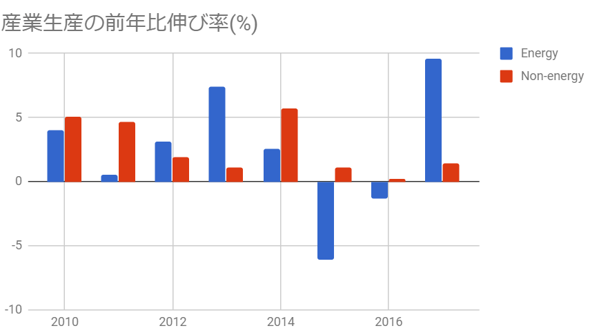 下図は米国におけるエネルギー産業と非エネルギー産業の生産額前年比伸び率です。一目瞭然なように、2017年の米国における生産の拡大はエネルギー生産の拡大によるものなのです。