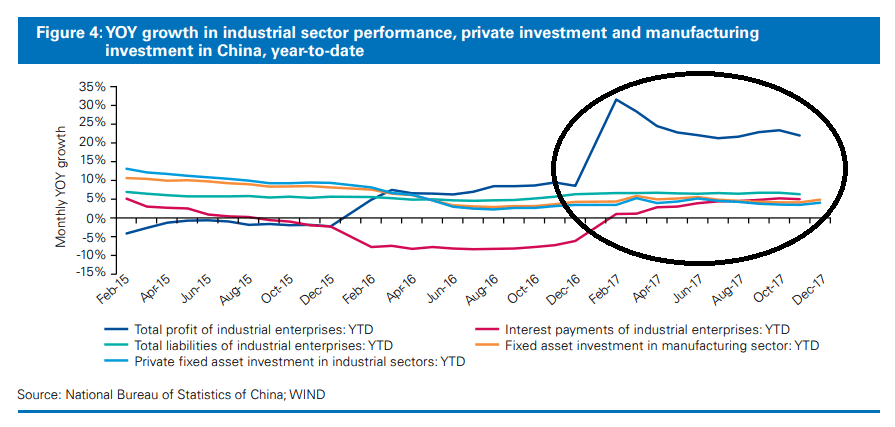 下図の青線は中国の産業セクター(素材・製造業)利益の前年比伸び率を表しています。2016年初にプラス成長に転じ、2017年には2-3割という非常に大きな成長となりました。