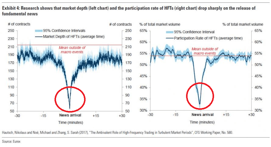 下図のように、何か大きなニュースが飛び込む数分前後で、アルゴリズム取引の市場の深さも、取引参加率も、それまでが嘘のように急減するのです。