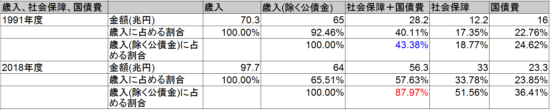 この数字を使って公債金を除く歳入に占める「社会保障+国債費」の割合を計算すると、「99.38%」になります。