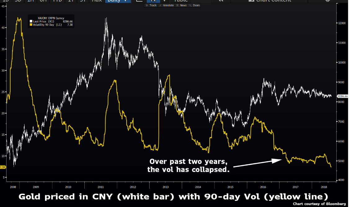 2017年以来の人民元建て金価格のボラティリティ(価格変動率)は、ここ7-8年で最低となっています。