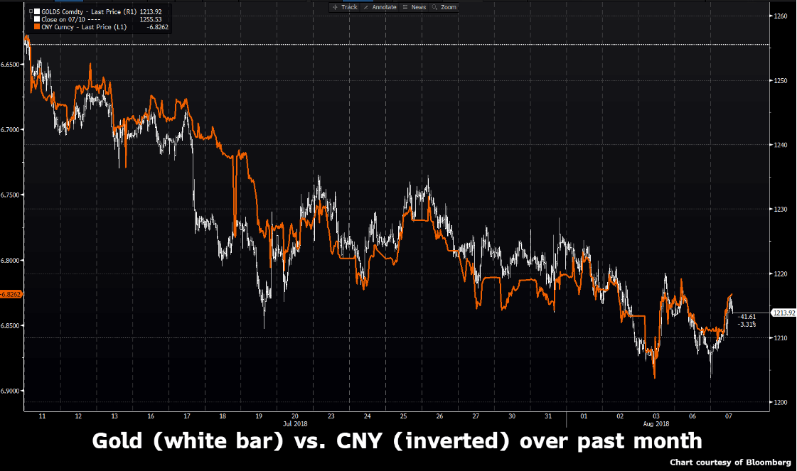 ドル建て金価格とドル元為替レートの推移を見ると、ここ1ヶ月ほど金価格と人民元が非常に高い正の相関で動いてきたことがわかります。