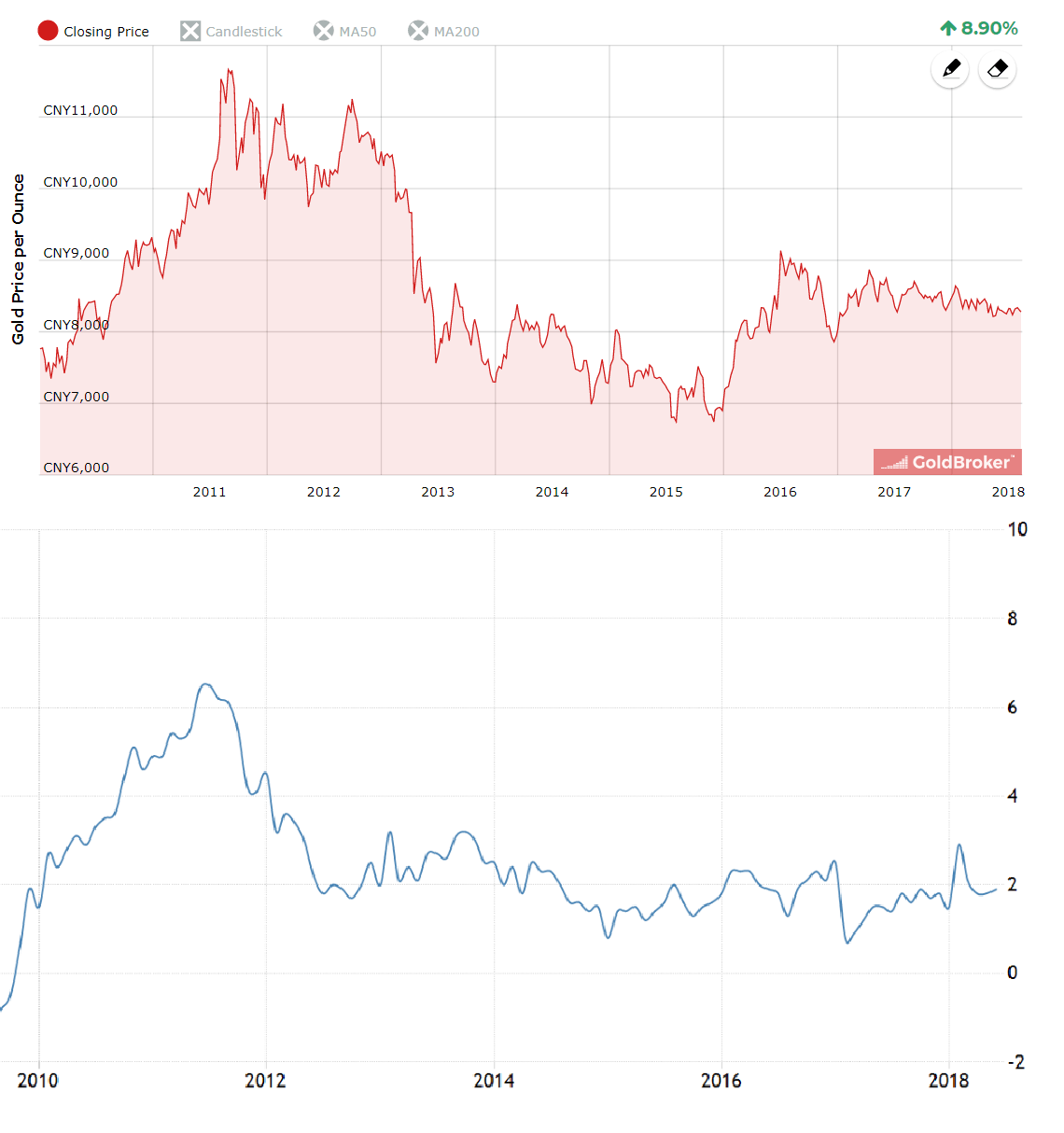 2016年半ば頃からはインフレ率が上昇しても人民元建て金価格が下落する傾向が見られますがインフレ率が2-3%という低位で推移していることは無視できません。