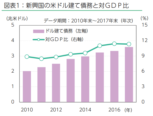 2017年末時点で、新興国の対外債務は約3.6兆ドル(約400兆円)と、2010年末に比較して約8割増加しました。