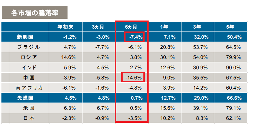 新興国株式の騰落率でさえ-7.4%であり、世界の株式市場と比較して中国株は大負けしている状況です。