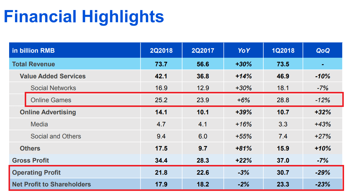 8月15日に発表されたQ22018(2018年第2四半期)決算で、テンセントの営業利益は前年比3%減、前期比では29%も減少してしまいました。純利益は前年比2%減です。