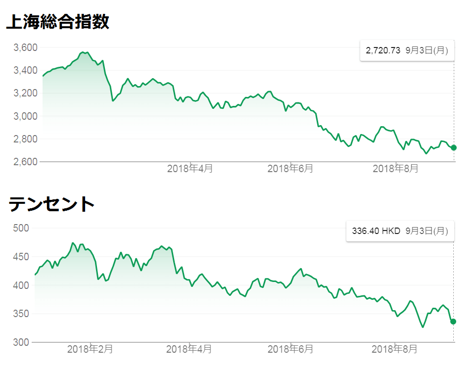 テンセントの株価も、上海総合指数と似たような株価下落の推移をたどっています。