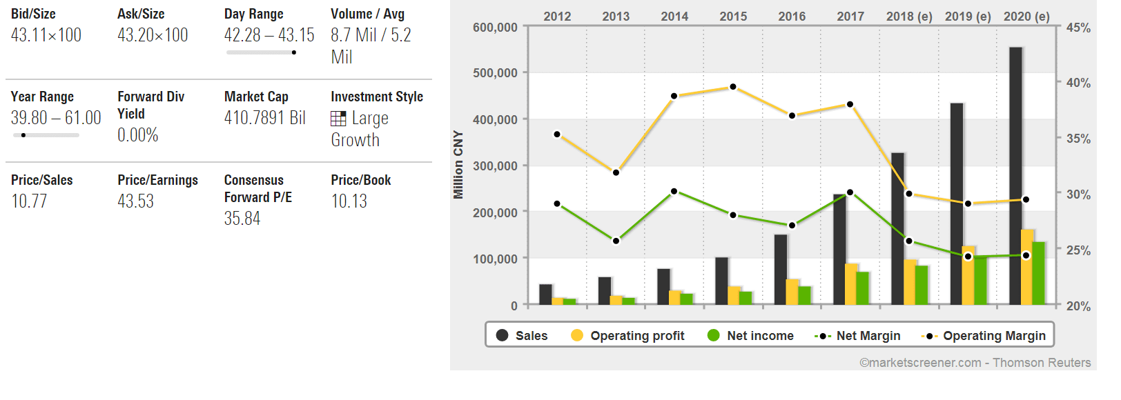 2017年に株価が2倍以上上昇したテンセントですが、2018年に入り株価は下げ始め、今年1月のピークから25%以上下がっています。