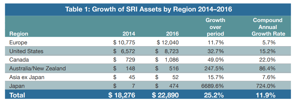 2016年時点で、社会的責任投資(ESG投資)運用資産は22.9兆ドルもあります。年間10%以上で成長しています。欧米が中心です。