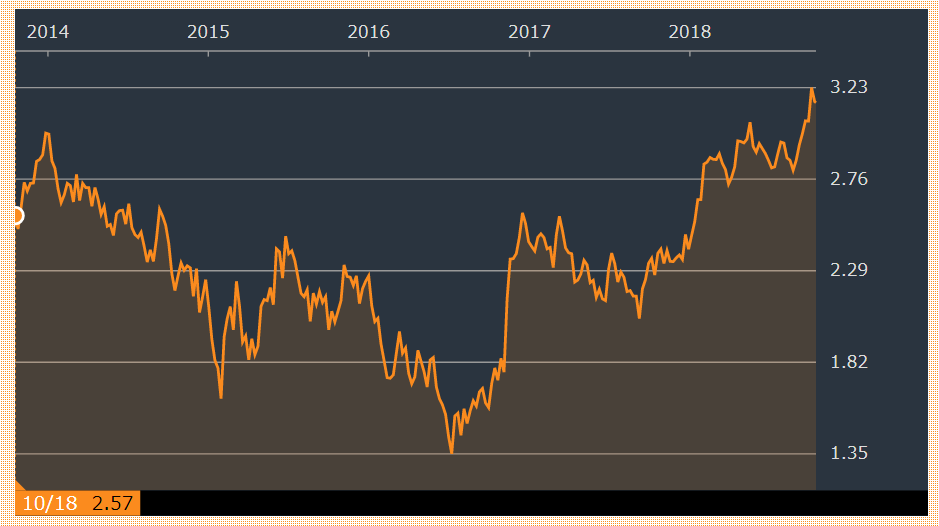 一方で米国のインフレ率は7月から下がり気味ですし、またトランプ発言の前日、IMFが世界経済見通しを発表し、2019年の米国経済成長率を前回より引き下げたばかりです。これより米長期金利の原因をインフレ率の上昇や米経済成長の過熱だと見る意見は政治的な力を持ちません。