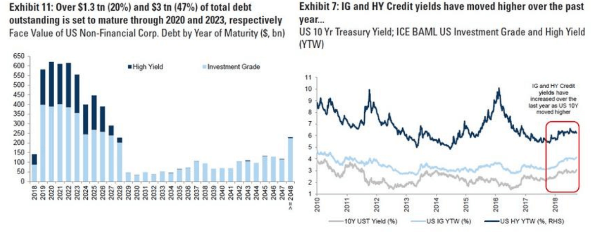 現在から2023年にかけて米国企業の発行済み社債の半分近くにのぼる3兆ドルが満期を迎え、借り換えを迫られます。2020年まででも1.3兆ドルの社債が満期を迎えます。