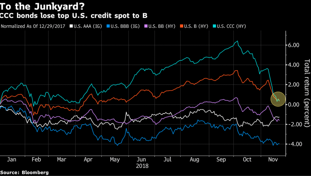しかし今年10月に入り投資適格債券、ジャンク債ともに価格が下がり(利回りが上昇し)、これまで年初来プラスのリターンだったBやCCC格付けの社債も年初来のリターンがすべて吹き飛びました。