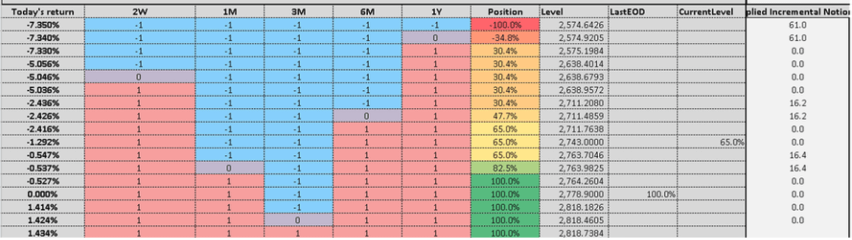 上のモデルによれば、特にS&P500指数が2575付近でポジションが「30.4%→-100%」であり、一気に1218億ドルの株式が売られるそうです。