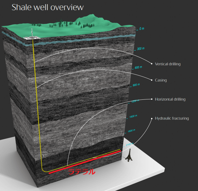 [ラテラルとは]ラテラルとは、シェール岩盤の水平に直線な部分のことです。シェールエネルギーの生産では、ラテラルに向けて地面と垂直に掘り、ラテラルに達するとシェール内を水平に掘っていきます。この方が生産性が高まるためです。