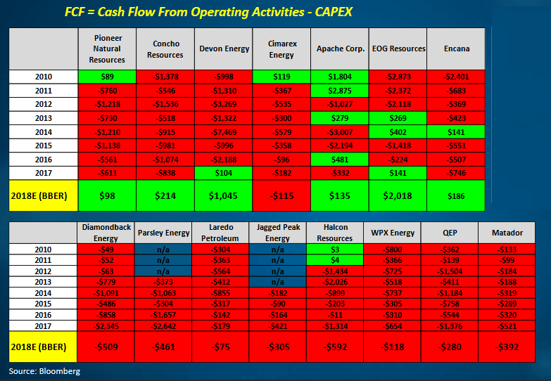 原油価格が上昇傾向にあった2017年までは大半のシェール企業のFCFはマイナスであり、2018年という「年初から原油価格が高い状況が続いた」年に入り、ようやくFCFがプラスのシェール企業が出てきたというのが現実です。