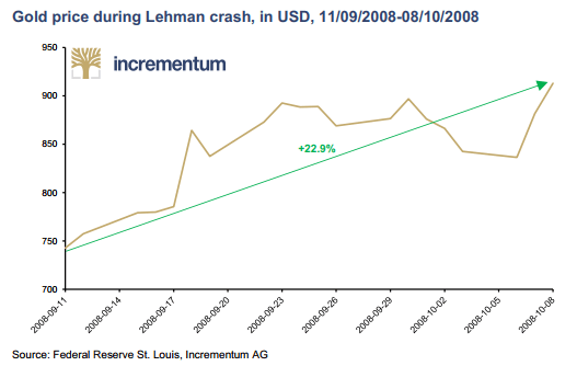 最後に、リーマン危機における2008年9月11日から10月8日までの4週間のドル建て金価格の推移を載せておきましょう。