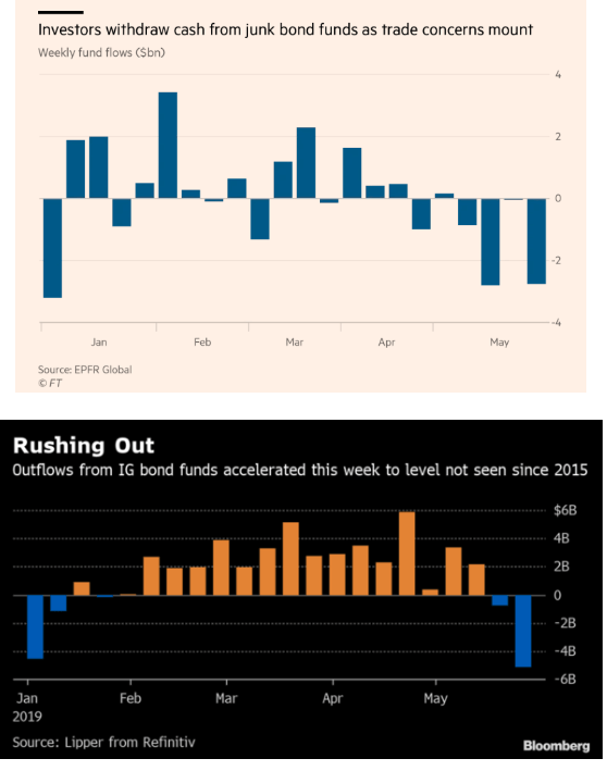 ジャンク債市場からは4週連続で資金流出が続き、投資適格債券市場からも5月の第4週から資金流出が起き、第5週には2015年12月以来の規模である51億ドルの資金流出がおきました。