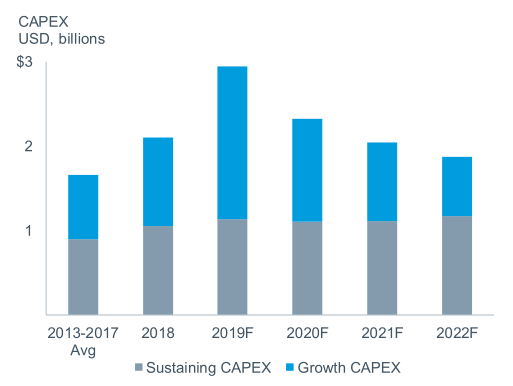 2022年の設備投資は19億ドルを予定しており、昨年の設備投資のピークからおよそ11億ドル減ることになります。