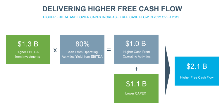 その結果、2022年には10億ドルの営業CFの増加+11億ドルの設備投資の削減により、21億ドルのFCFが新たに産出されるとしています。これは昨年のFCFに近い数字ですから、3年間でFCFがほぼ倍増することを意味します。