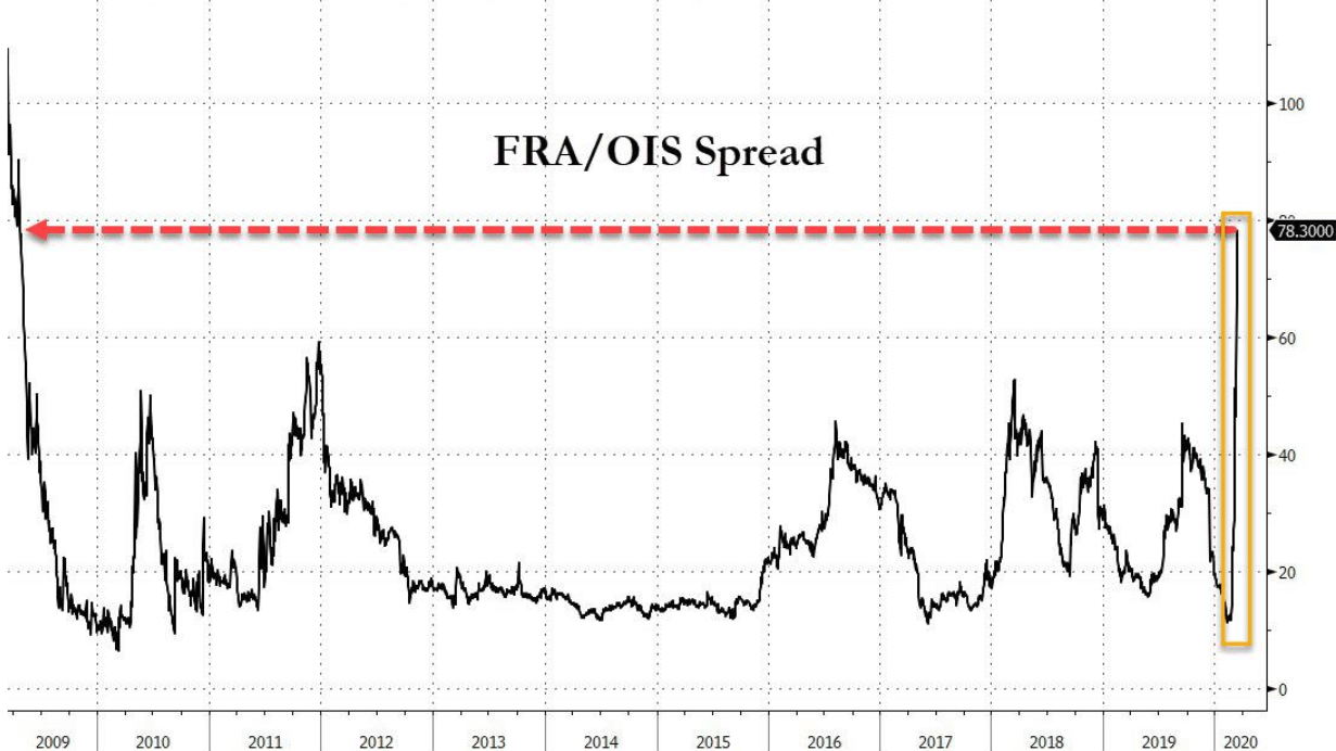 銀行間取引市場の米ドル流動性の指標であるFRA/OISスプレッドは先の金融危機以来の水準にまで急騰しました。
