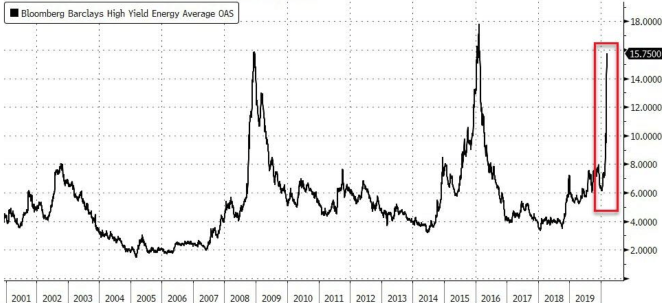 エネルギー会社が発行するハイイールド債と米国債の利回り差は急騰し、リーマンショックや2016年初の当時の原油価格大底時並みの水準となりました。