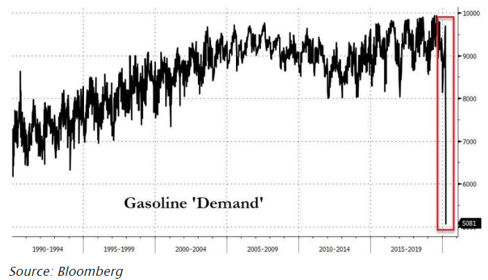 ガソリン需要は外出禁止令で自動車走行距離が大きく低下し、過去30年間に一度もなかった水準にまで落ち込んでしまいました。