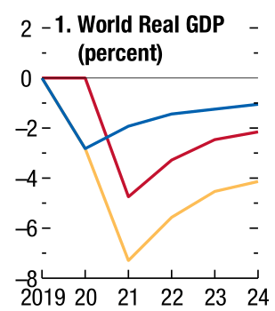 青線の経済低迷長期化シナリオでは、今年こそ世界全体の経済成長率は6%減るものの、2021年以降はプラス成長が続くとの見通しです。