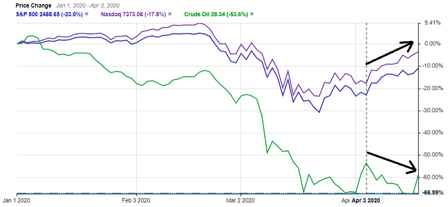 株価と原油価格は比較的同じ方向に値が動くものですが、4月に入り、欧米でCOVID-19の拡大ペースが弱まり経済の早期回復期待が好感され始めている株価に対し、原油価格は停滞を続けています。