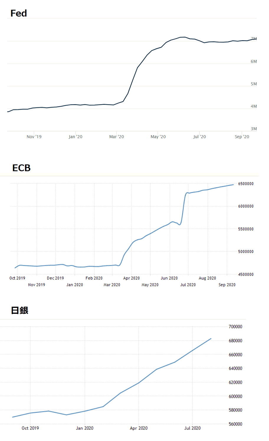 現在、FedとECBのバランスシートの拡大規模は限定的です。日銀のみ現在も量的緩和に積極的で、毎月10-20兆円規模の量的緩和を進めています。