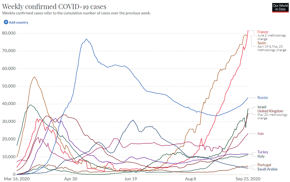 9月に入ると英国の他、ロシア、イスラエル、イランでも再び感染拡大が見られるようになりました。
