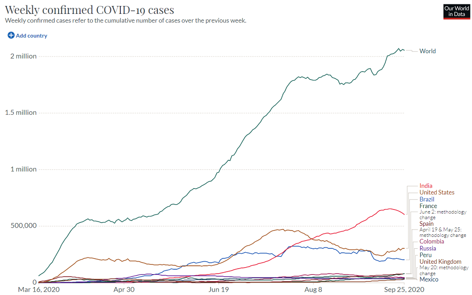 9月に入り欧州での新規感染者数の伸びがじわりと世界全体に影響を及ぼし始め、9月半ばから米国でも感染者数が増えだし、世界全体の新規感染者数も再び増えだしました。