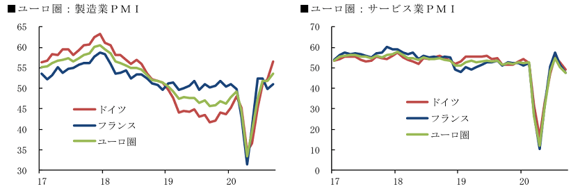 ユーロ圏の景況感指数の9月の速報値を見ると、製造業はドイツで大幅に改善するなど上昇基調が続いていますが、移動制限・営業制限等の影響を直接受けるサービス業はユーロ圏全体で6月レベルに下がり、50を下回りました。