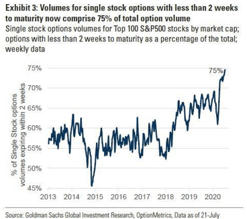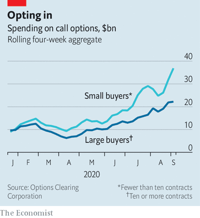 失業給付金を使ってバクチ目当てで若者の素人投機家がハイテク株やそのオプションを購入するなか、アップルとテスラが夏に株式分割をして割安感が出たことで、8月の一層の買いにつながりました。