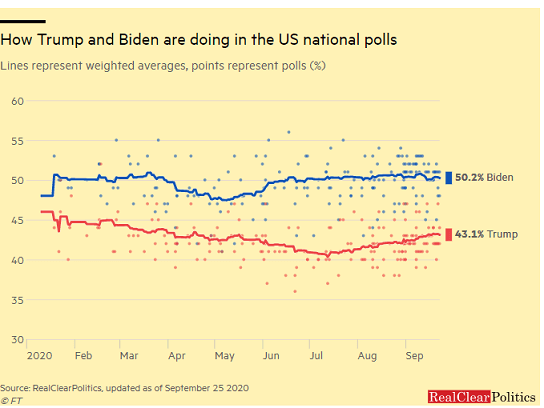 現在、バイデン候補の支持率はトランプ大統領を7%程度上回っていますが、4年前と同様にトランプ政権支持を知られたくない「隠れトランプ支持者」は一定数いるとみられており、選挙結果はかなり拮抗することが予想されます。