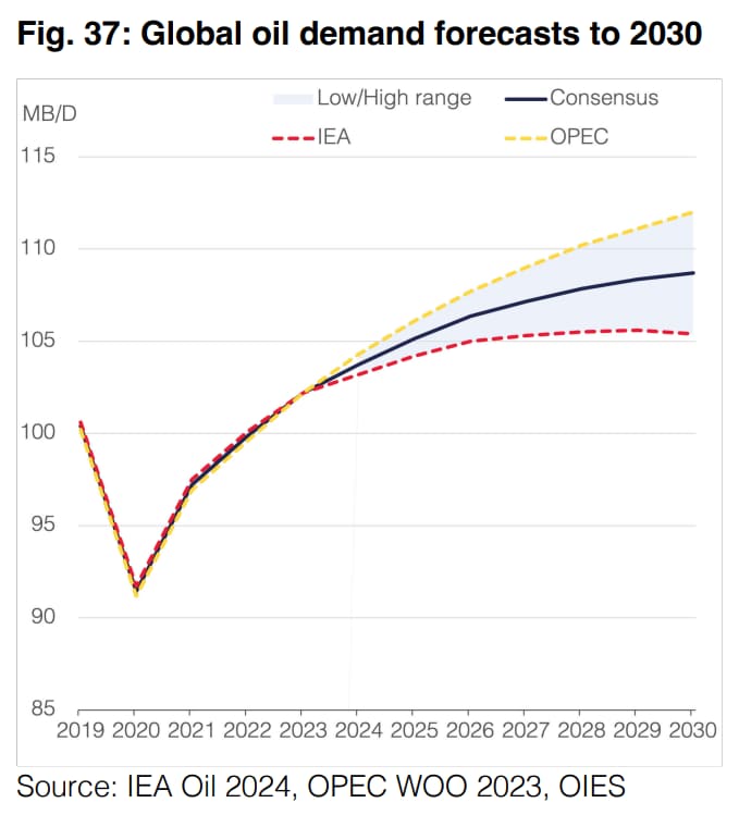 隔たりがあるのは短期的見通しだけでなく、下図が示すように2030年にかけての長期的な石油需要の見通しでも同様で、年が進むに連れ隔たりは大きくなっています。