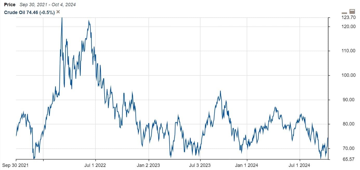 先月終わりから中東戦争激化への懸念から原油価格は1バレル74.5ドルにまで値上がりしました。でも戦争が激しさを増す割には原油価格はそこまで値上がりしていません。