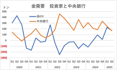 24年後半以降の金需要の増加は金ETFが牽引しています。かつては金値上がりの足を引っ張る存在であった投資家が「ゴールド・バグ」になっています。