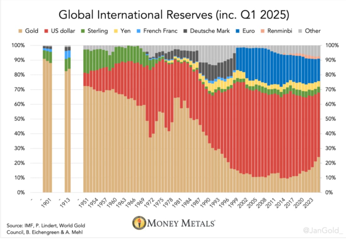 最近の金価格の急激な値上がりもあり、現在ゴールドは世界の準備資産の25%程度を占めるまでに急拡大しています。