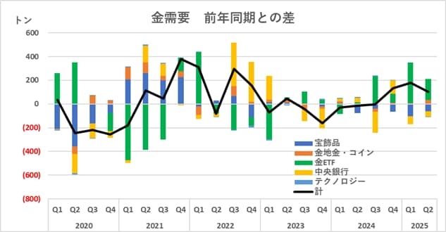 下図は中央銀行、金ETFだけでなく宝飾品、金地金・コイン、産業用を含めた金買い越し量が前年同期からどれくらい増減したのかを示しています。