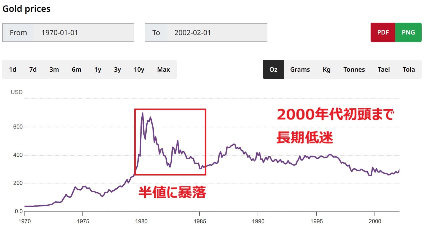1970年代のスタグフレーションの時代も、1980年にかけて金価格は10倍に上がりましたが、その後半値にまで暴落し長期低迷を迎えましたから。