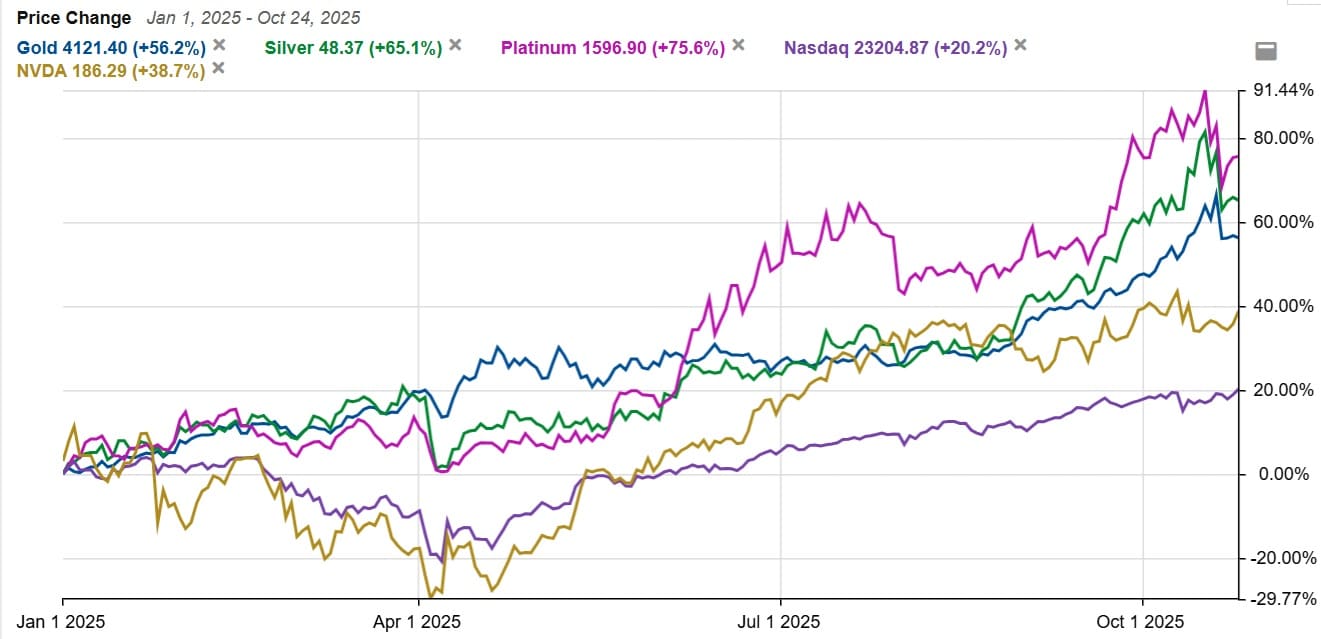AIバブルの陰で、ハイテクバブルを上回る貴金属の上昇トレンドが続いてきました。