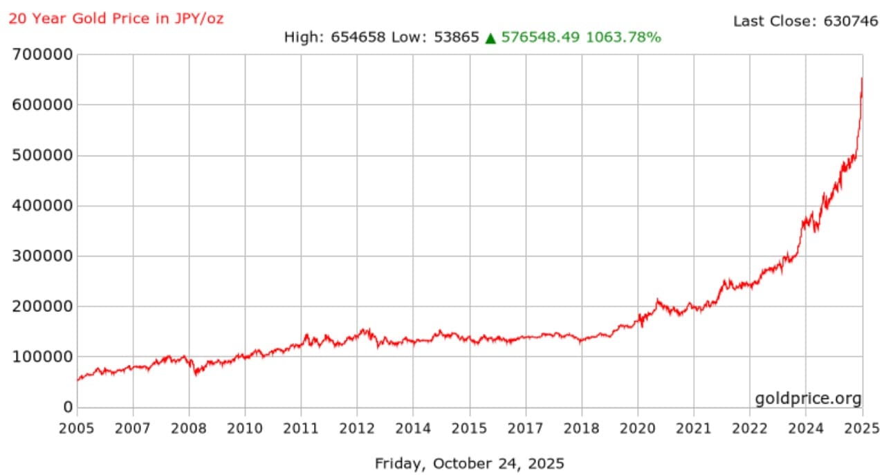 過去20年で円建て金価格は11倍以上になりました。逆に言えば金を基準にすれば日本円の価値は11分の1になったわけです。日本円の紙屑化はもう相当程度進んできたのです。